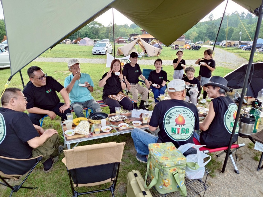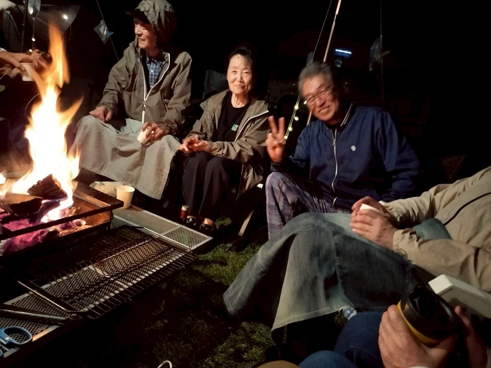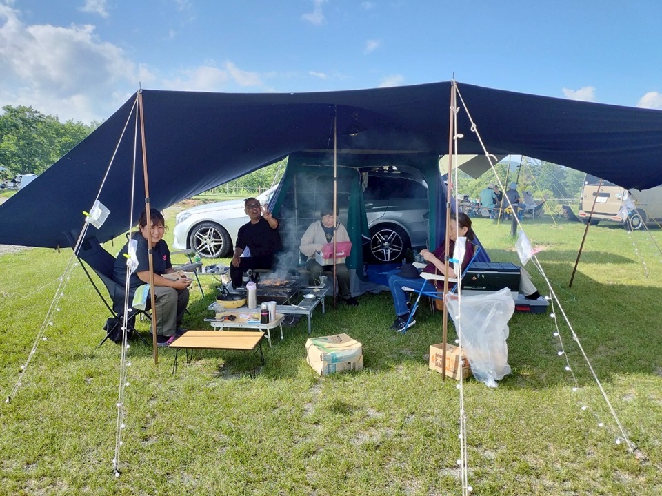 4.サイト風景 1サイト2家族で使用 5.午後の焼肉 6.恒例の焚火は小雨風のため タープ下で小規模で開催