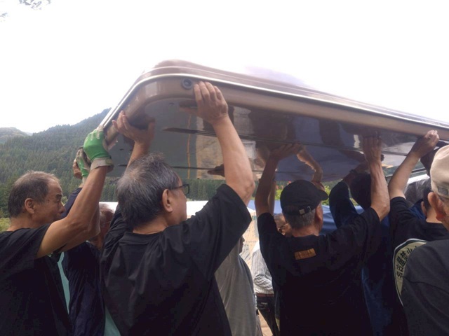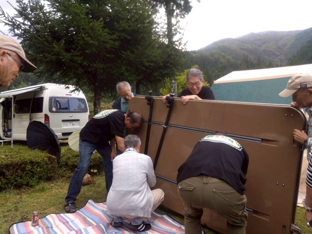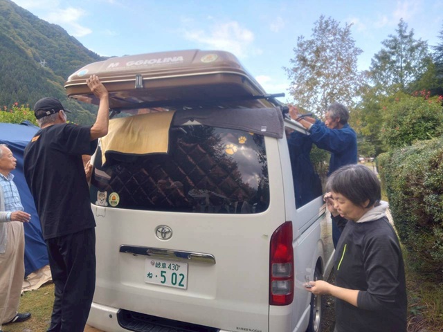 4.メルセデスからルーフテント降ろす 汗だくで大変でした 5.ルーフテント立てるだけで疲労 6.ハイエースに乗せ換え 全員疲労マックス フラフラでした